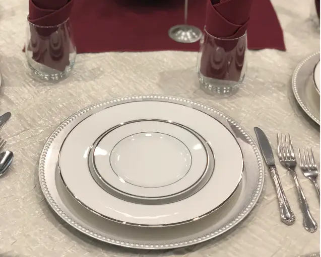 Hosting a small dinner event at your home or maybe having a large wedding? We take the worry and mess out of having dinner for your guests with our dinnerware rentals. Idaho Tents & Events has several different dinnerware options from white to ivory plate ware and several different styles of flatware. One of the best parts of renting your dinnerware from us is that we wash it for you! All you need to do is return the dirty dishes into the crates we provide and we wash them. Along with our matching glassware it is very easy to host a beautiful dinner and not have to clean up any of the mess. Come by our showroom to see our different options in person and pick out your favorites.