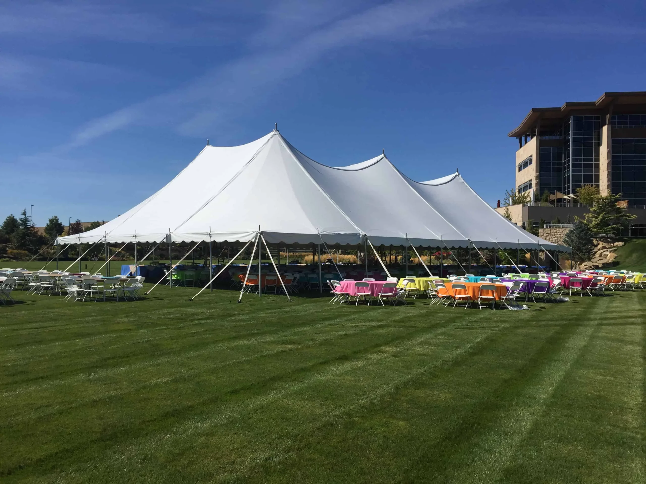 Now that you’ve decided to rent a tent, it is time to figure out how large of a tent you need. Using our simple tent-sizing calculator you can easily calculate the approximate square footage that you will need to accommodate your group. If you want to add a dance floor or a stage or some custom tables, please keep that in mind as they all take additional space. If you are having a hard time trying to figure out how large of a tent you need, please feel free to give us a call or stop by, and we will put together a custom quote for you.